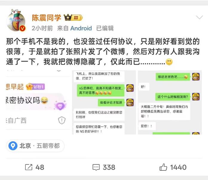 今日,陈震回应称:“那个手机不是我的,也没签过任何协议,只是刚好看到觉的很薄,于是就拍了张照片发了个微博,然后对方有人跟我沟通了一下,我就把微博隐藏了,仅此而已。“