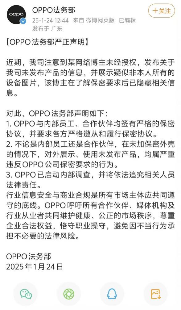 对此,OPPO 法务部发布声明称,公司与内部员工、合作伙伴均签有严格的保密协议,要求各方严格遵守;未经授权发布未上市产品信息的行为严重违反了公司的保密要求;公司已启动内部调查,并将依法追究相关人员的法律责任。