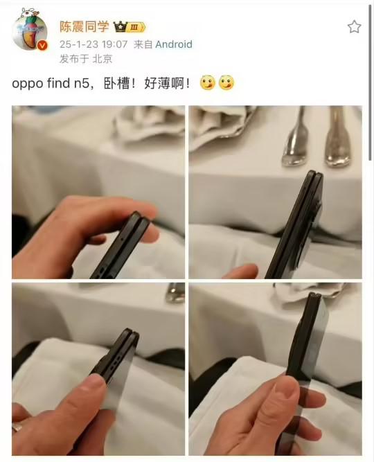 ZAKER 科技 1 月 24 日消息,知名车评人陈震因提前曝光 OPPO Find N5 折叠屏手机的真机照片登上微博热搜。